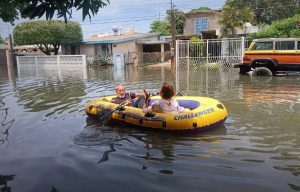 Abuelitos salen en lancha inflable tras inundaciones en Tamaulipas