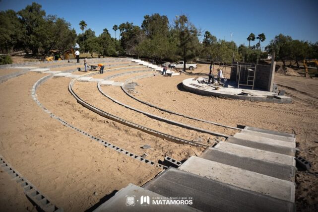 H. Matamoros, Tamaulipas.- El Gobierno Municipal que encabeza Beto Granados continúa avanzando en la transformación de los espacios públicos de Matamoros, demostrando su compromiso con el bienestar y la convivencia de las familias. Uno de los proyectos más destacados es la construcción del Cinema al Aire Libre en el Parque Niños Héroes “El Laguito”, donde ya se pueden apreciar importantes avances en su desarrollo.
