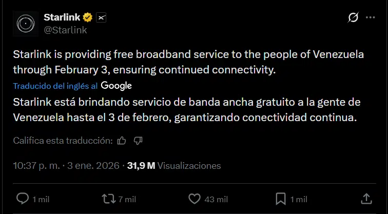 El anuncio fue realizado a través de la cuenta oficial de SpaceX en la red social X, donde se informó que la medida busca mantener a la ciudadanía informada y comunicada en un contexto de alta incertidumbre. De acuerdo con la empresa, el servicio se habilita para evitar que la población permanezca incomunicada ante la situación actual del país.