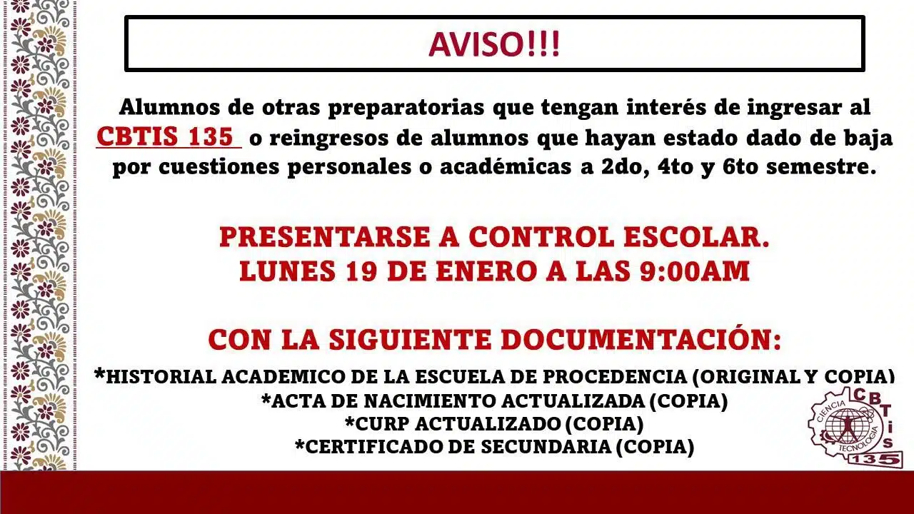 Matamoros, Tamaulipas.— El Centro de Bachillerato Tecnológico Industrial y de Servicios (CBTIS) 135 lanzó un aviso dirigido a alumnos de otras preparatorias interesados en ingresar a esta institución, así como a estudiantes que deseen reingresar tras haber causado baja por motivos personales o académicos en 2°, 4° o 6° semestre.