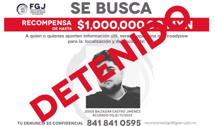 Jesús Baltazar Castro Jiménez fue detenido luego de permanecer cinco meses prófugo en el estado de Nuevo León. Durante su búsqueda, las autoridades emitieron un boletín de recompensa de un millón de pesos, hasta lograr su captura.