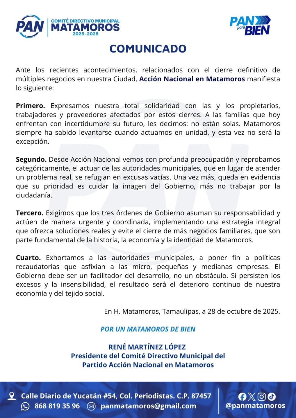 Acción Nacional hizo un llamado a los tres órdenes de gobierno para implementar una estrategia integral que ofrezca soluciones reales y evite el cierre de más negocios familiares, considerados una parte esencial de la economía e identidad matamorense. Finalmente, el PAN exhortó al Gobierno municipal a poner fin a las políticas recaudatorias que, aseguran, “asfixian a las micro, pequeñas y medianas empresas”. Subrayaron que el Gobierno debe fungir como un facilitador del desarrollo y no como un obstáculo, advirtiendo que de continuar los excesos “el resultado será el deterioro continuo de nuestra economía y del tejido social”. El comunicado fue emitido este 28 de octubre de 2025, bajo el lema “Por un Matamoros de bien”.
