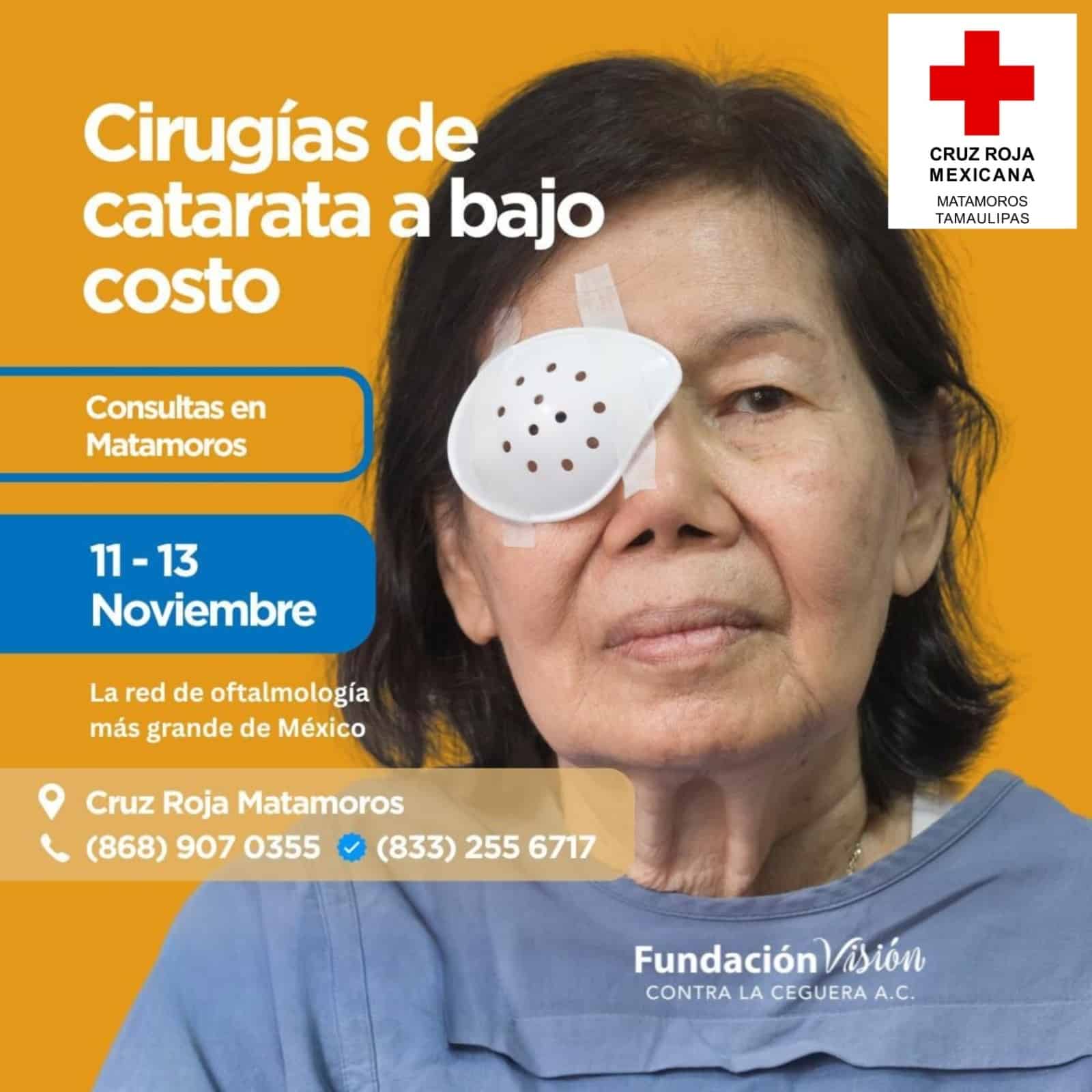 Matamoros, Tamaulipas.— La Cruz Roja Mexicana Delegación Matamoros, en coordinación con la Fundación Visión contra la Ceguera A.C., llevará a cabo una jornada de consultas y cirugías de catarata a bajo costo del 11 al 13 de noviembre en las instalaciones de la benemérita institución.