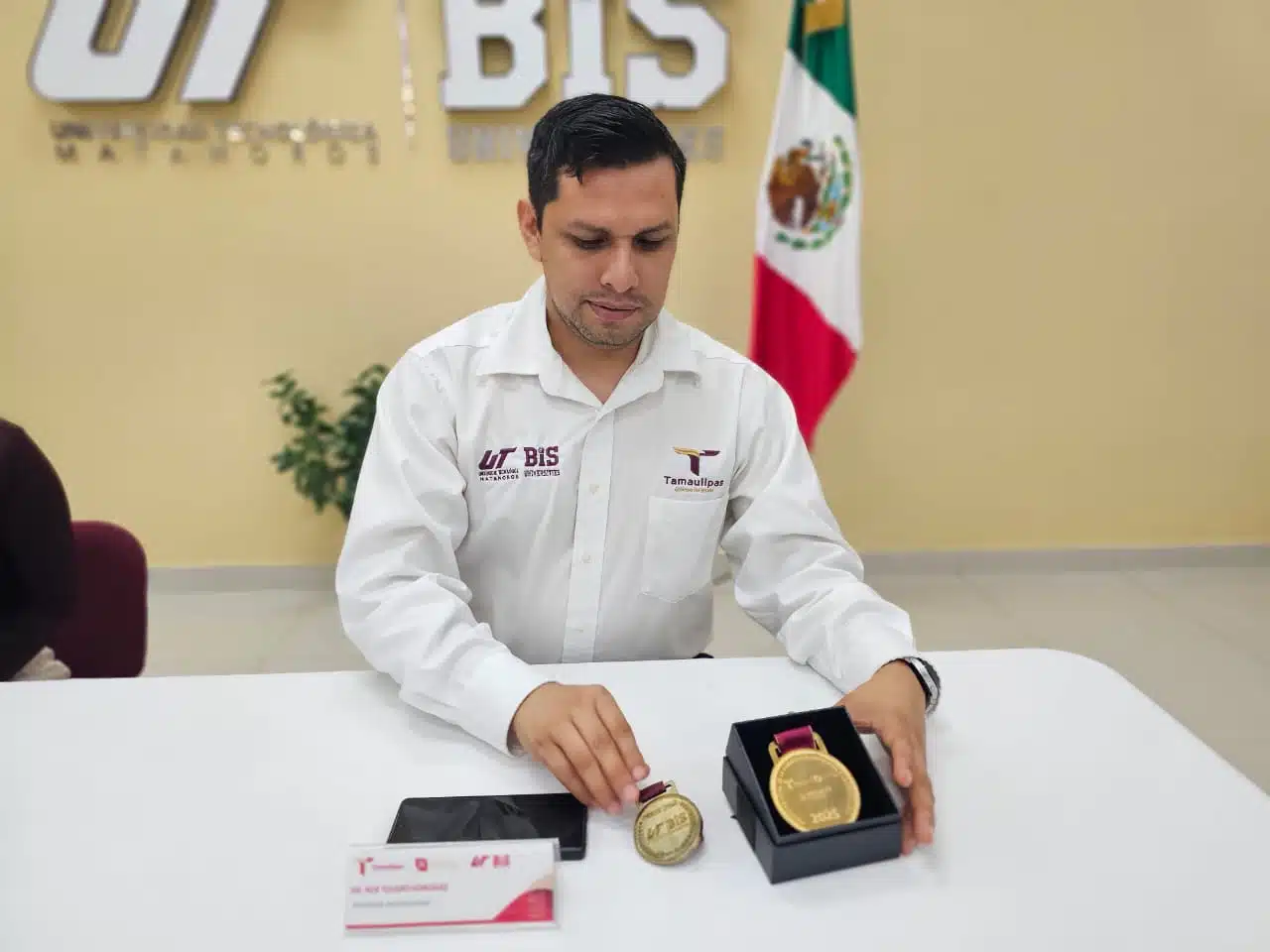 Matamoros, Tam. — El profesor investigador Noé Toledo González, adscrito al área de Tecnologías de la Información de la Universidad Tecnológica de Matamoros (UTM), recibió un reconocimiento estatal por su contribución al desarrollo académico, científico y tecnológico, en el marco de los programas de fomento a la innovación impulsados por el Gobierno de Tamaulipas.