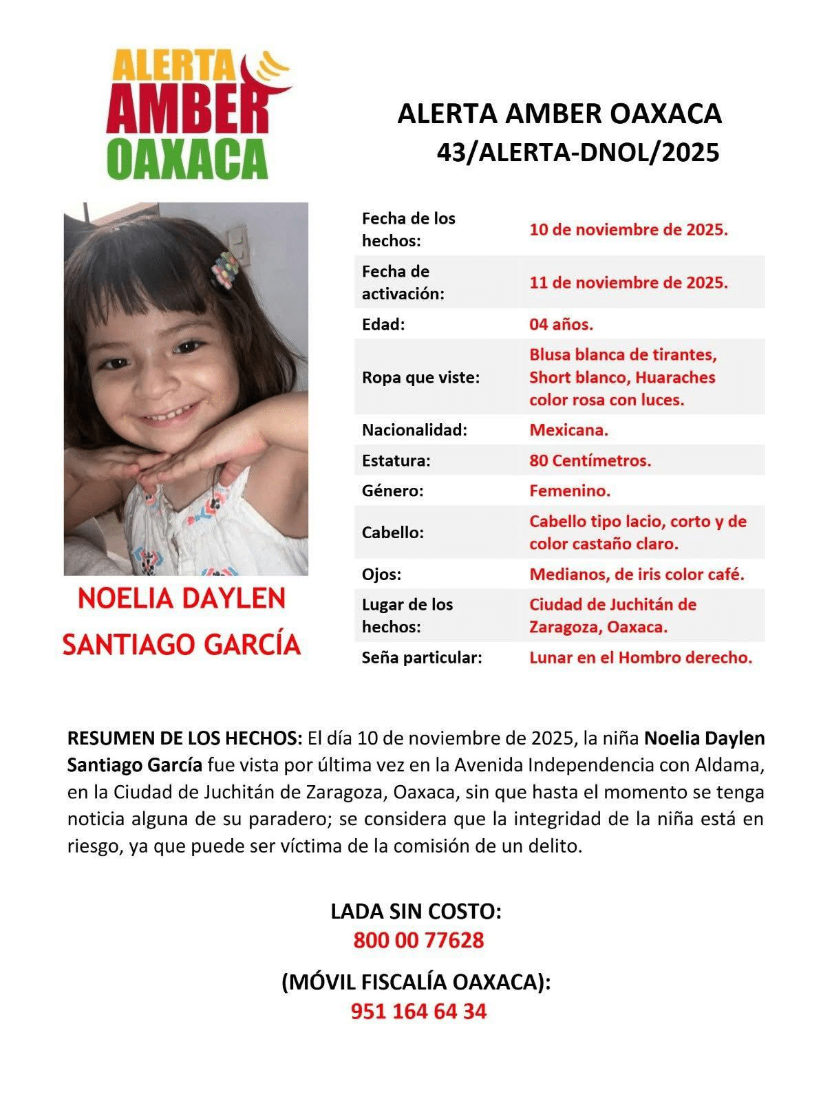 Asimismo, la Fiscalía General del Estado de Oaxaca, a través de la Unidad de Atención de Personas No Localizadas, emitió la Alerta AMBER Oaxaca número 43, con el propósito de ampliar la búsqueda y solicitar el apoyo de la ciudadanía.