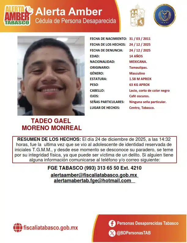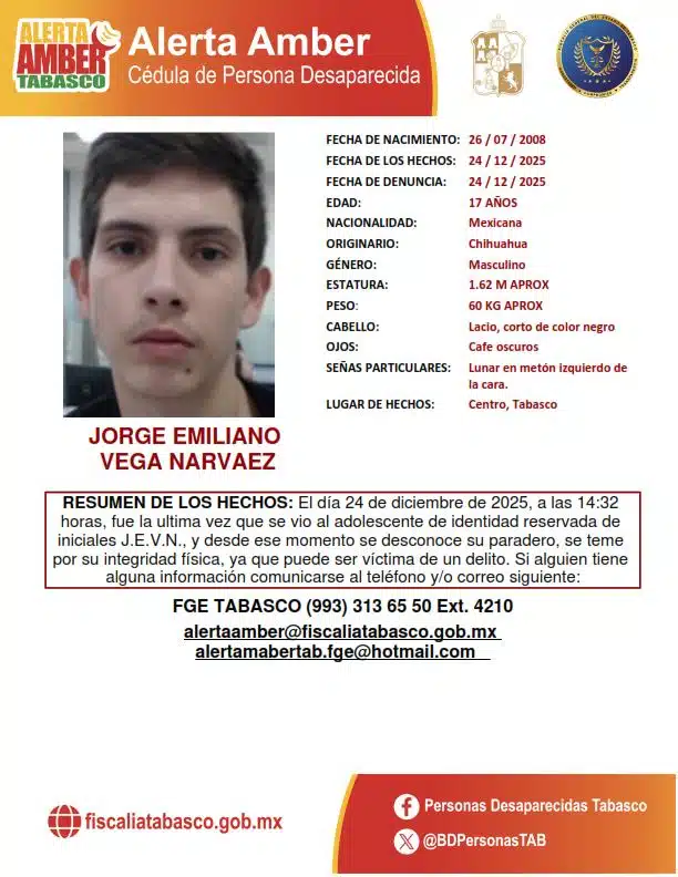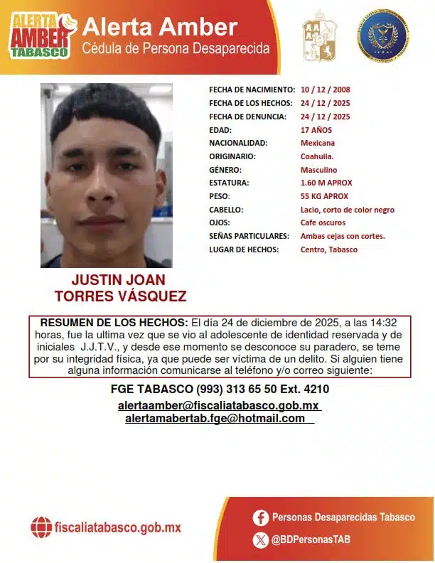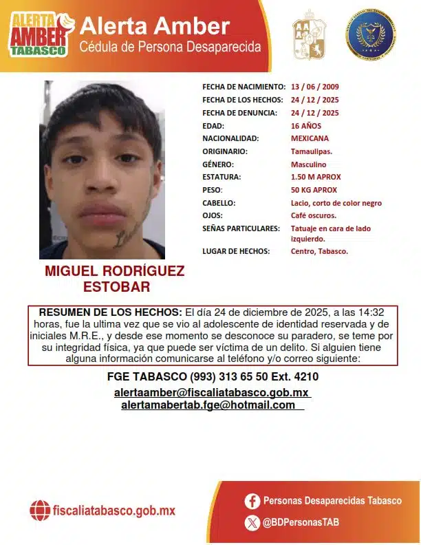 La Fiscalía General del Estado (FGE) de Tabasco informó que cinco de los seis adolescentes reportados como desaparecidos en el municipio de Centro, Tabasco, en vísperas de Nochebuena, ya fueron localizados, mientras que uno de ellos continúa en calidad de desaparecido.