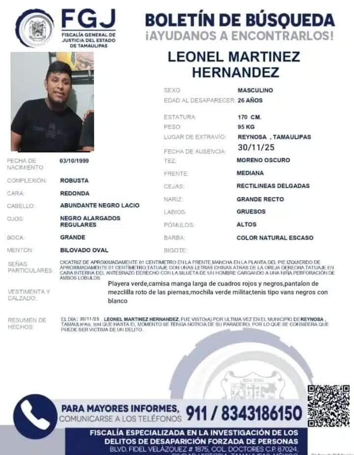 La Fiscalía General de Justicia del Estado de Tamaulipas emitió un boletín de búsqueda para localizar a Leonel Martínez Hernández, de 26 años, quien fue visto por última vez el 30 de noviembre de 2025 en el municipio de Reynosa, Tamaulipas.