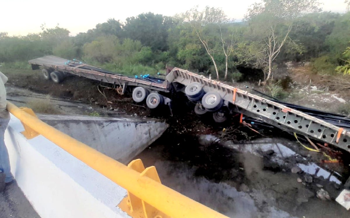 Soto La Marina, Tamaulipas.– Un socavón se formó sobre la Carretera Federal 180 Costera del Golfo, a la altura del kilómetro 109, provocando el cierre total de la circulación y que un tractocamión de doble remolque saliera de la cinta asfáltica.