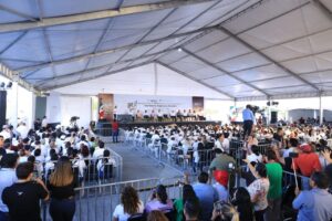 Como parte de su gira de salud, la presidenta Sheinbaum acompañada por la secretaria de Bienestar, Ariadna Montiel y el secretario de Salud, David Kershenobich, presidió al mediodía, en Tampico, la asamblea del programa de Salud Casa por Casa, que beneficia a los adultos mayores y personas con discapacidad.