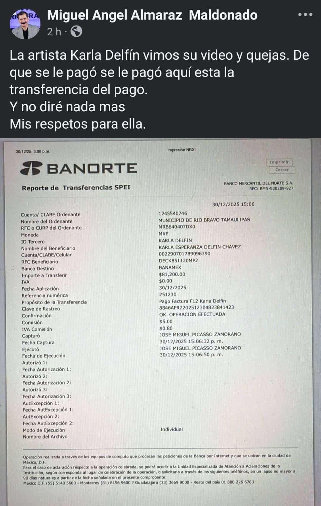 Ante los señalamientos, el alcalde Miguel Ángel Almaraz Maldonado respondió a través de sus redes sociales, donde aseguró que el pago correspondiente sí fue realizado, acompañando su declaración con una imagen de una transferencia bancaria SPEI, fechada el 30 de diciembre de 2025, a nombre de la artista y bajo el concepto “Pago Factura F12 Karla Delfín”.